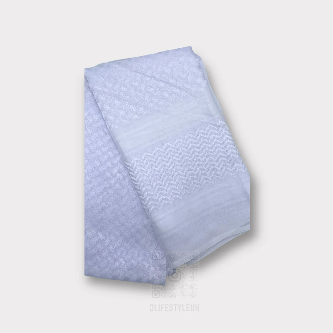A versatile White Keffiyeh Scarf, perfect for all seasons.